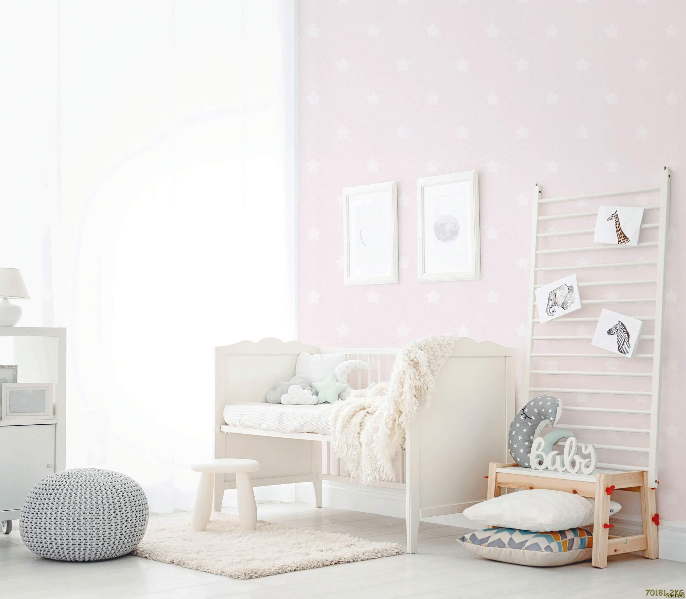 Giấy dán tường phòng ngủ trẻ em 70181-3 với hai màu xanh và hồng nhạt, họa tiết sao thích hợp cho phòng ngủ của bé 1 tuổi - 5 tuổi.