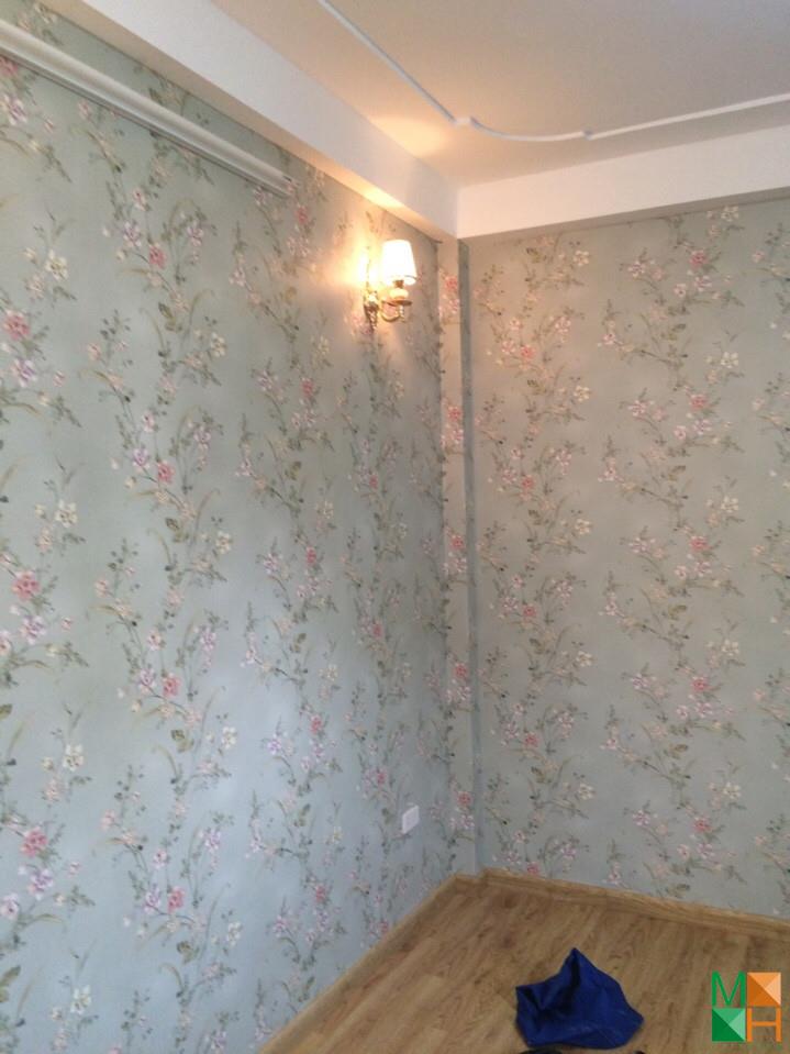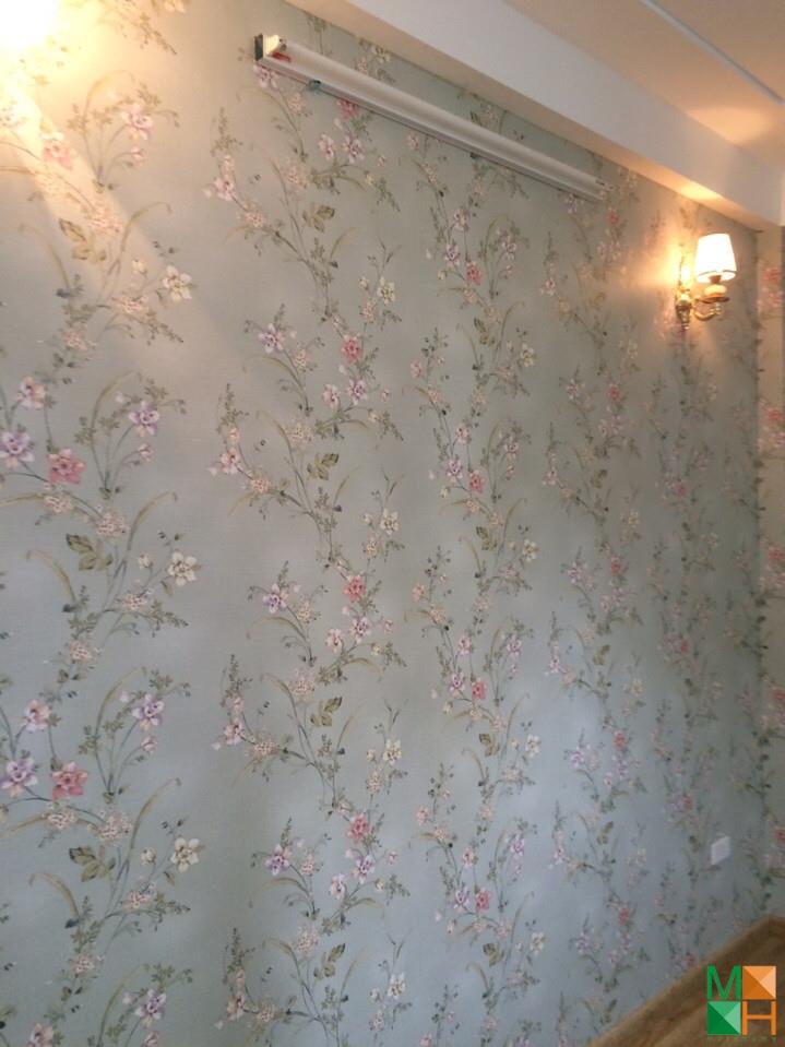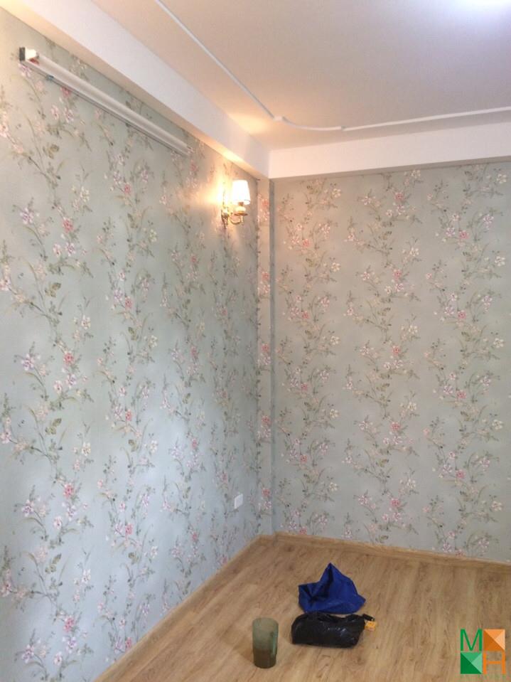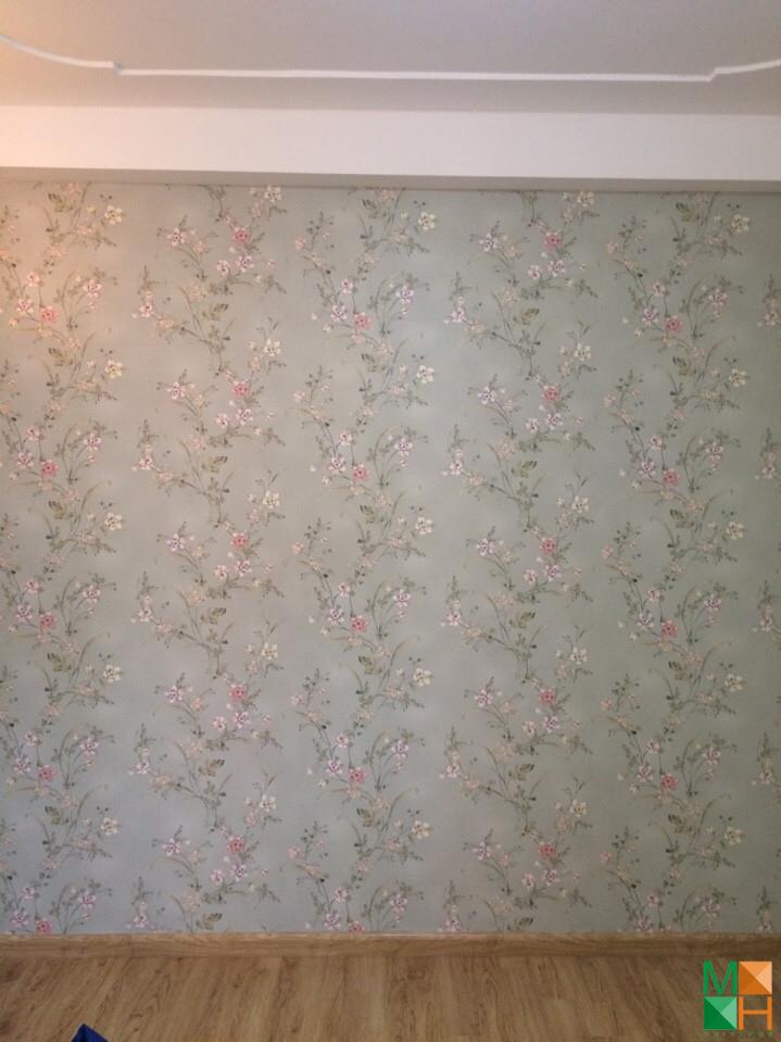 Thi công giấy dán tường hoa lá màu xanh